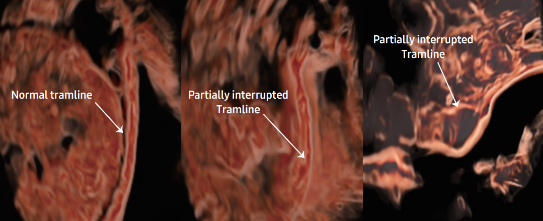 Признак «трамвайной линии», нормальная поверхности раздела слизистой оболочки мочевого пузыря и миометрия, который в норме не прерывается. В деталях признак можно оценить, исходя из трехмерных ультразвуковых данных, полученных трансабдоминально или трансвагинально и обработанных на ультразвуковом мониторе с использованием встроенного программного обеспечения приборов Samsung для последующей обработки CrystalVue и CrystalVue Flow.
