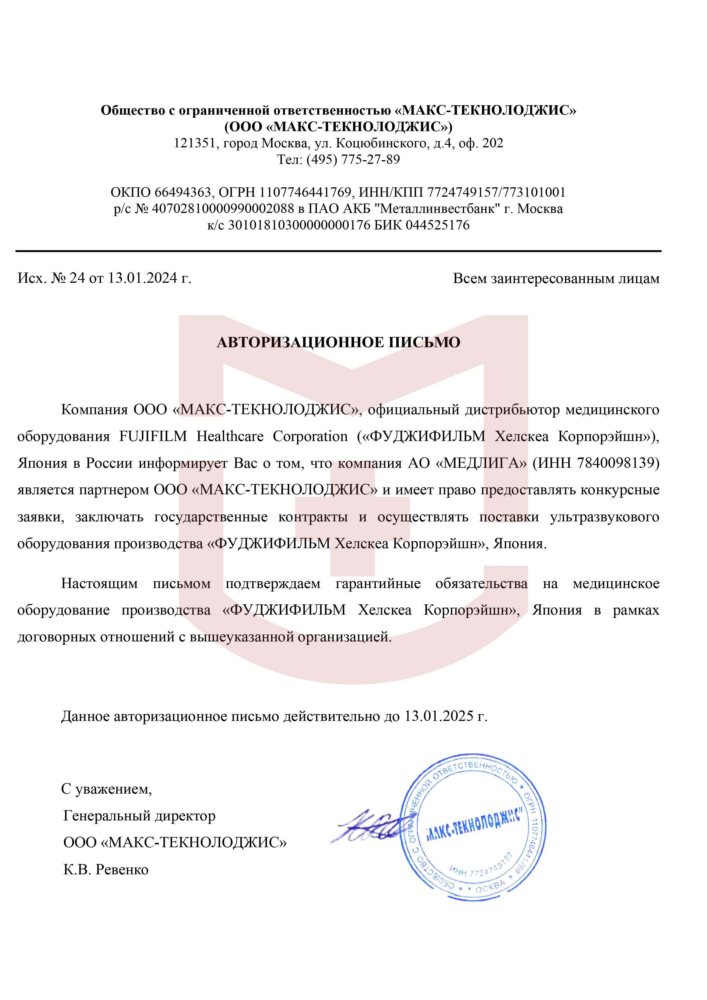 Авторизационное письмо FUJIFILM 2024 года