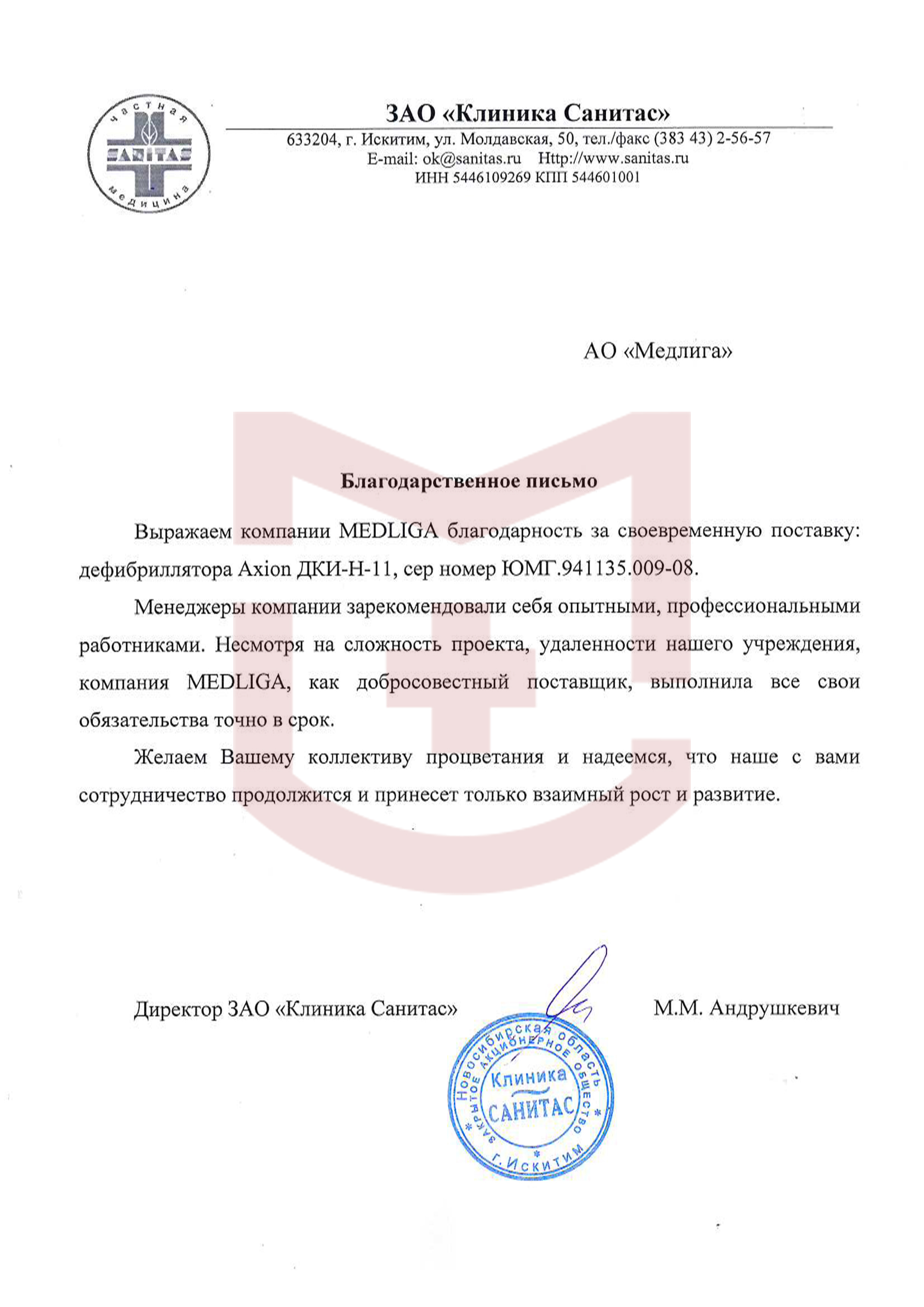 Выражаем компании MEDLIGA благодарность за своевременную поставку: дефибриллятора Axion ДКИ-Н-11, сер номер ЮМГ.941135. 009-08 .