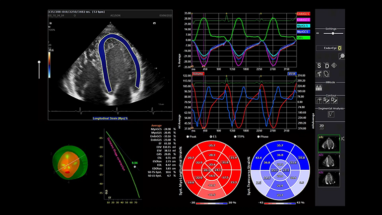 Векторный анализ кардиомиокинетики (syngo Velocity Vector Imaging).  syngo Velocity Vector Imaging поддерживает оценку глобальной и региональной механики движения сердечной мышцы, включая глобальную продольную деформацию.